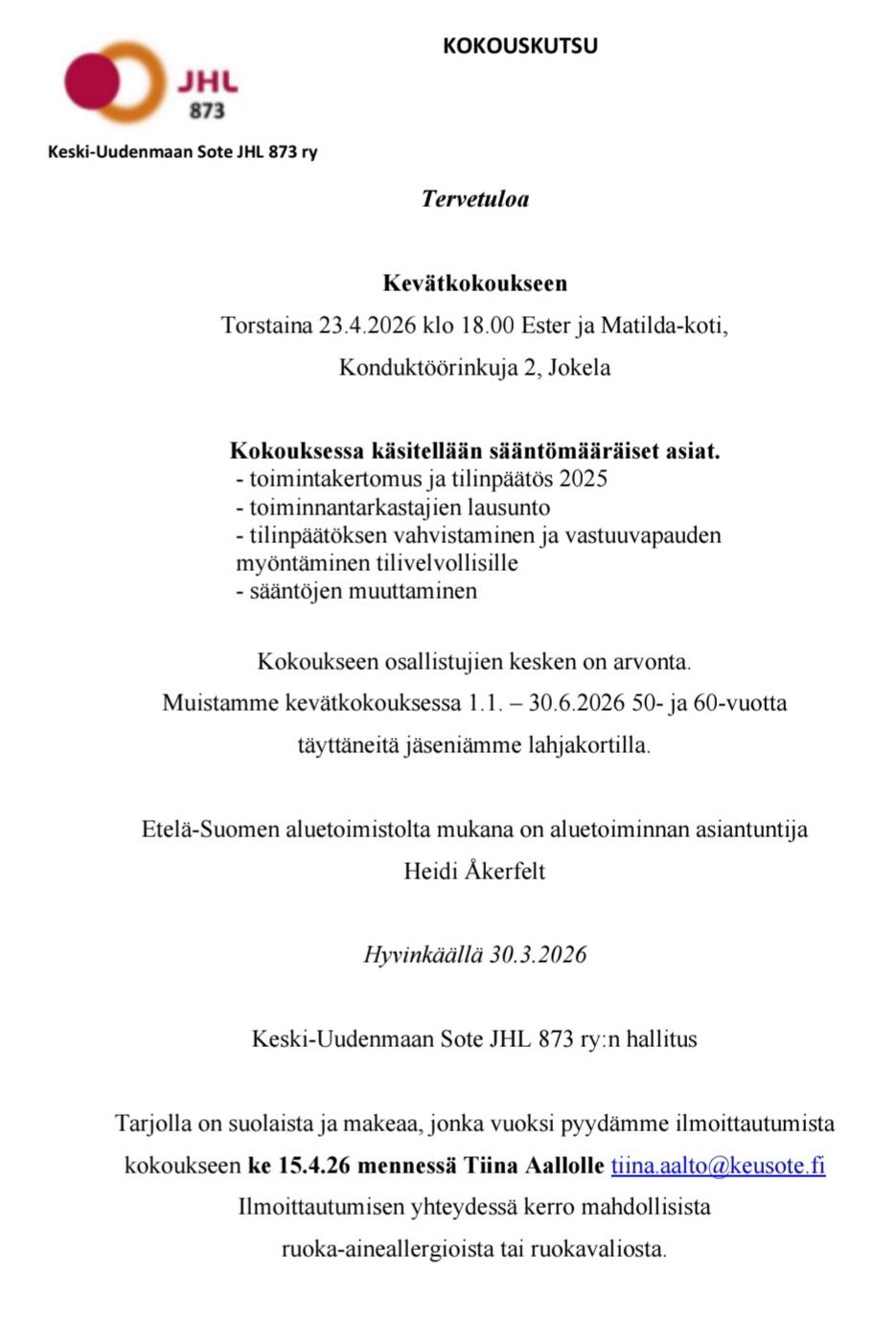 Jäsenistölle on lähetetty kokouskutsu sähköpostilla, jossa myös tarvittavat liitteet.