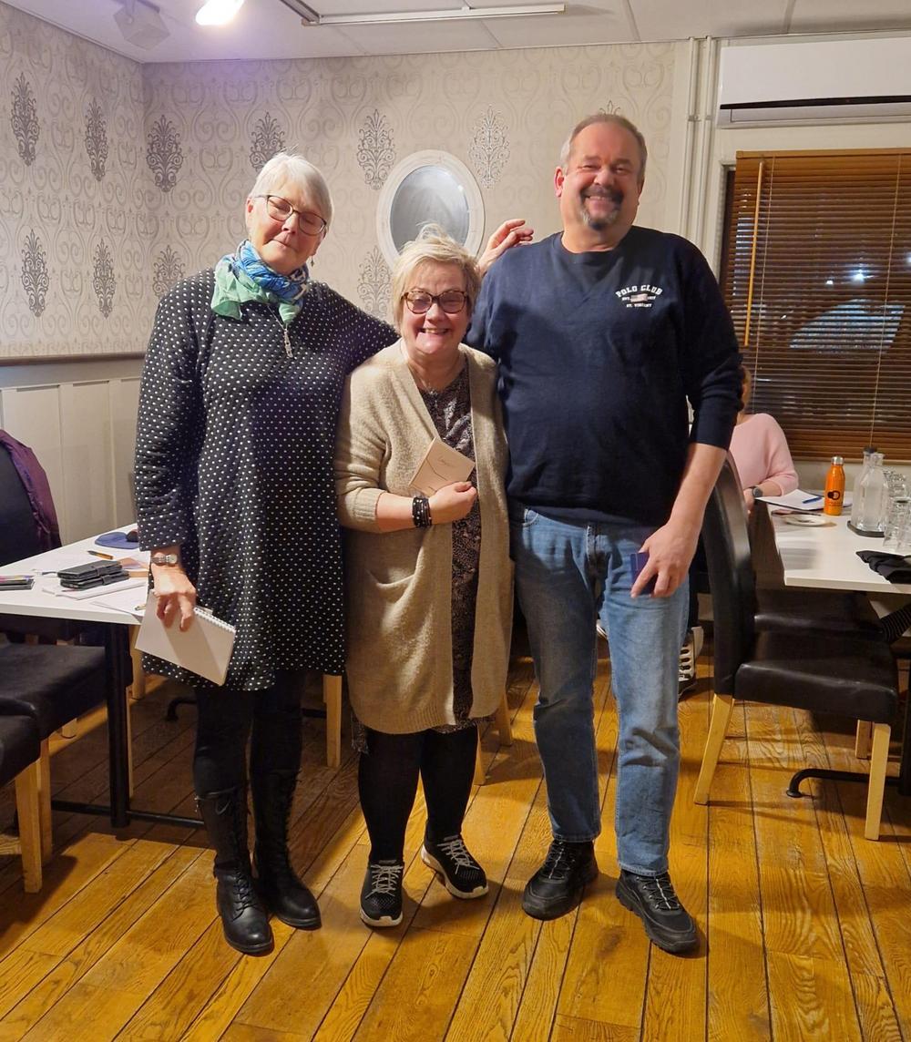 20€ lahjakorteilla muistettiin useita 50- ja 60-vuotta täyttäneitä, sekä vähintään 20v jhl-jäseninä olleita. Tässä kuvassa vain muutama muistettu jäsen ja pj Tiina, joka jakoi lahjakortteja.